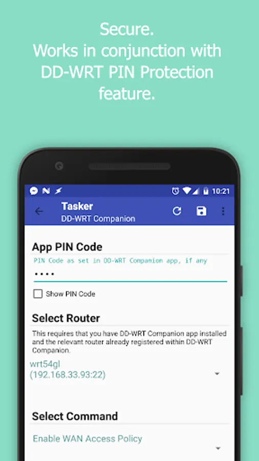 As security matters, this plugin works in conjunction with DD-WRT Companion PIN protection and third-party integration features.