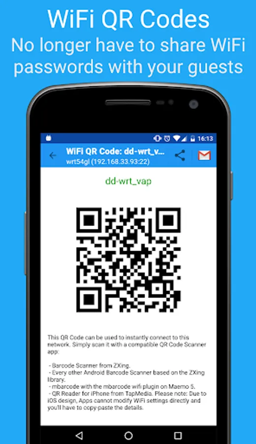 • Wireless Networks QR-Codes preview and sharing: you now no longer need to share your WiFi password to your guests. Just share the generated QR Code and they can connect instantly (provided they use a compatible QR Code scanner app)