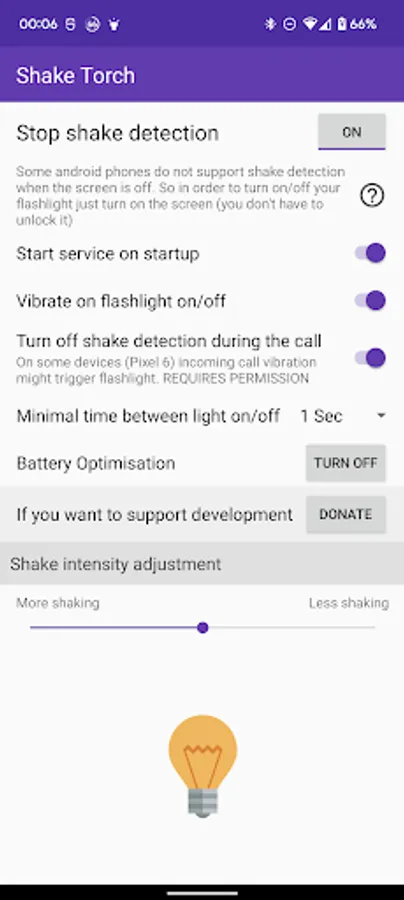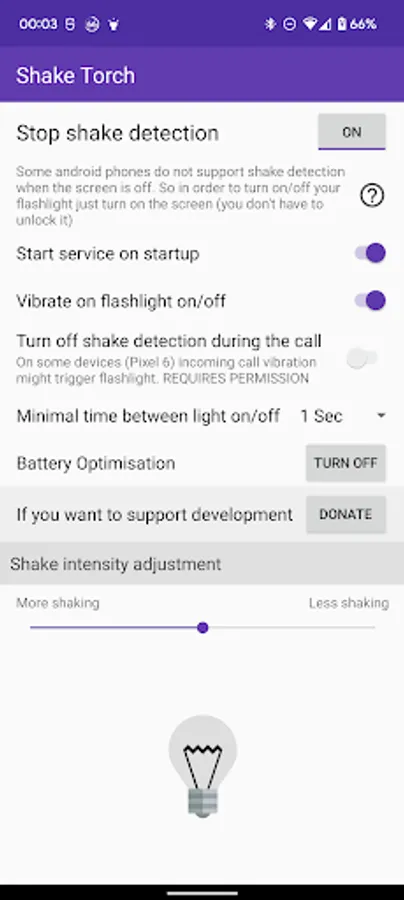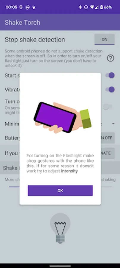 Shake your device to turn on/off the flashlight. It works even if your device is locked also prevents accidental triggering when your phone is in the pocket. Also, you can adjust shake sensitivity.