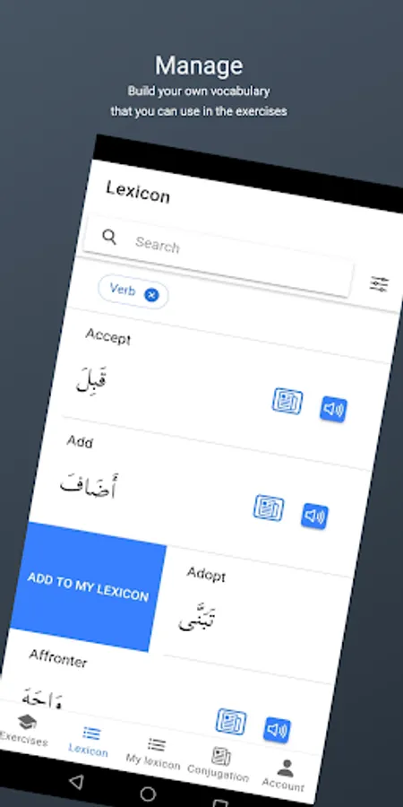 Completely free application, Kalimate helps you to learning the Arabic language: Conjugation and Masdar, Exercises and Revision on your own words.