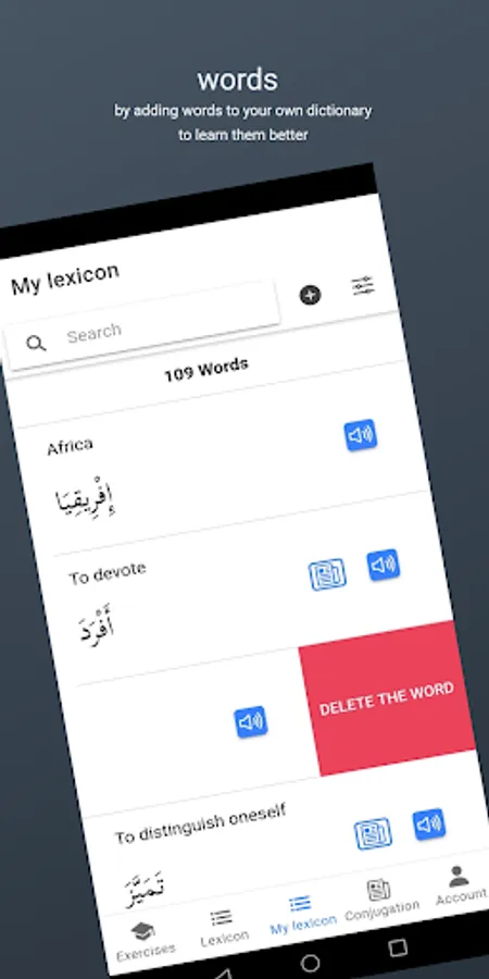 • Use of your own ‘dictionary’ of words that you enter and which is stored and completely free for use at hand (even without internet connection). The fact of informing and revising one's own words facilitates and accelerates their memorization and thus makes it possible to perfect one's vocabulary in Arabic language.