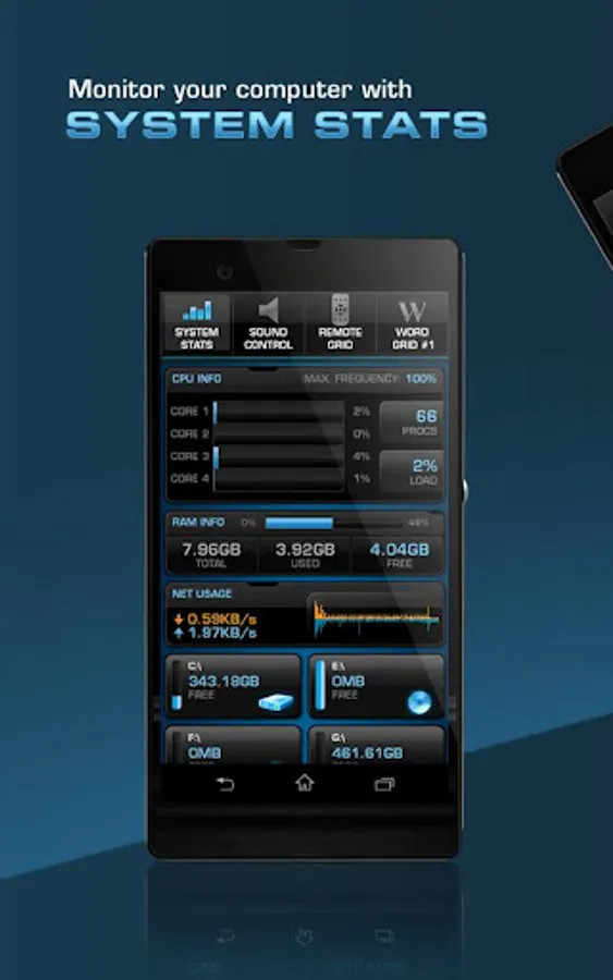 2. System Stats – monitor your vital system information, such as CPU load, memory & hard drive usage and more.