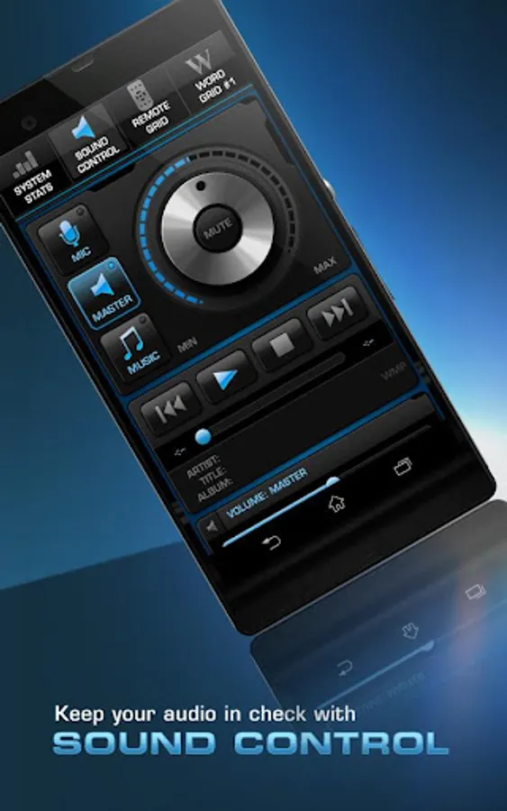 3. Sound Control – operate Windows Media Player and iTunes, as well as your system audio settings. Adjust the master volume, or the volume of each application individually.
