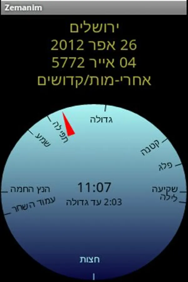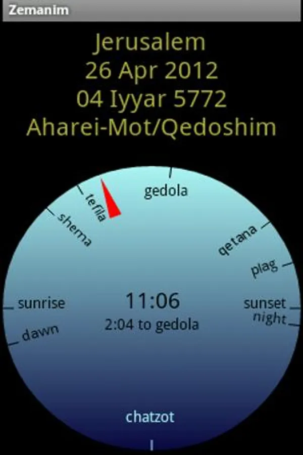 This application shows "halakhic", or Jewish legal, times ("zemanim", or "zmanim"). It displays them in an easy to understand format and is also simple to customize. Includes a built-in "luach" (Jewish calendar) as well as a prayer-direction indicator.