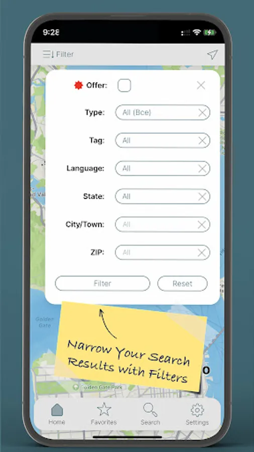 • Filter using location or listing type, tags, language, state, zip, and/or city to narrow your search;