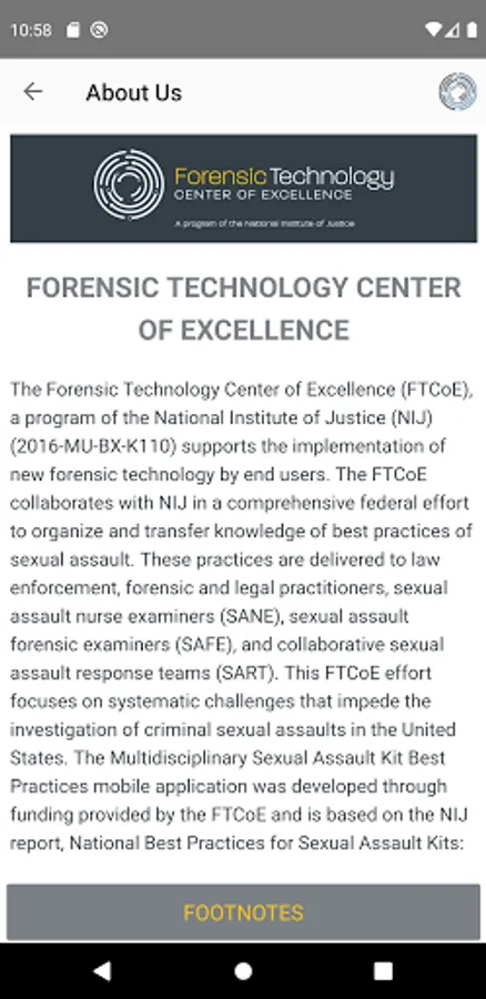The app also has links to the Center for Forensic Nursing Excellence International ’s Multidisciplinary Glossary on Sexual Violence, the PDF version of the National Best Practices for Sexual Assault Kits: A Multidisciplinary Approach, and the FTCoE website.