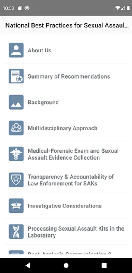 With the help of the Forensic Technology Center of Excellence (FTCoE), NIJ has developed the National Best Practices for Sexual Assault Kits mobile app to create a mobile-friendly version of the SAFER Working Group’s report. The National Best Practices for Sexual Assault Kits mobile app allows users to view the report on a mobile device, such as a smartphone, for easy recall of the report’s content.