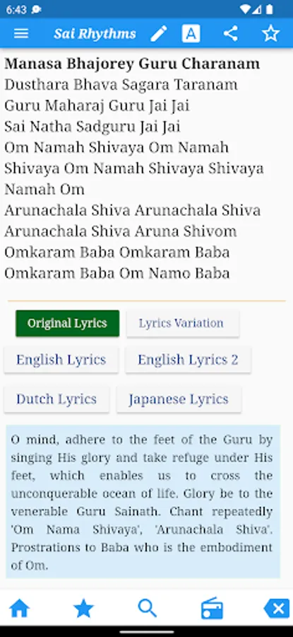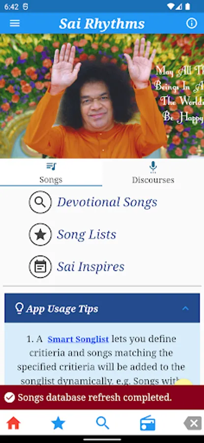 App works in offline mode. * Internet connection needed to play audio from Radiosai and to search Radiosai Audio Archives.