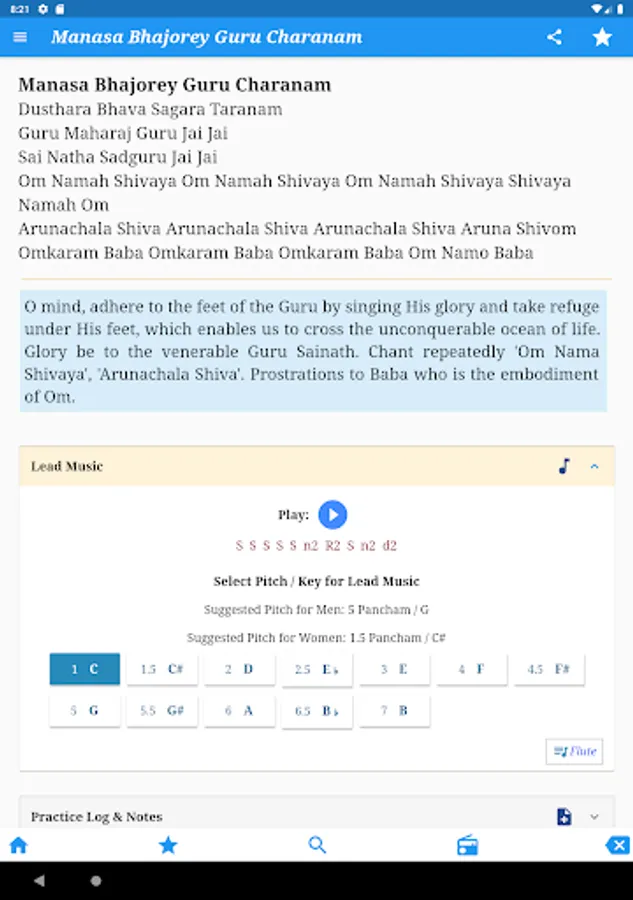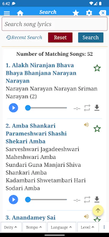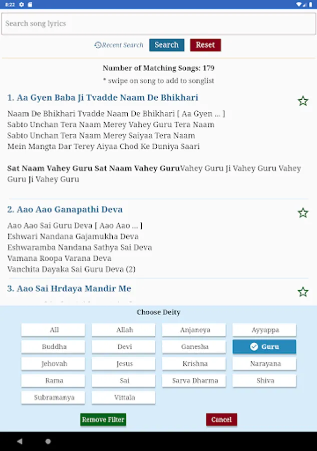 Search Devotional songs commonly sung in Sri Sathya Sai Centers, using a variety of criteria like lyrics, deity, level, tempo, and tune (raga).