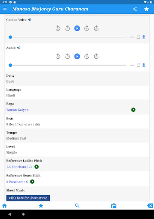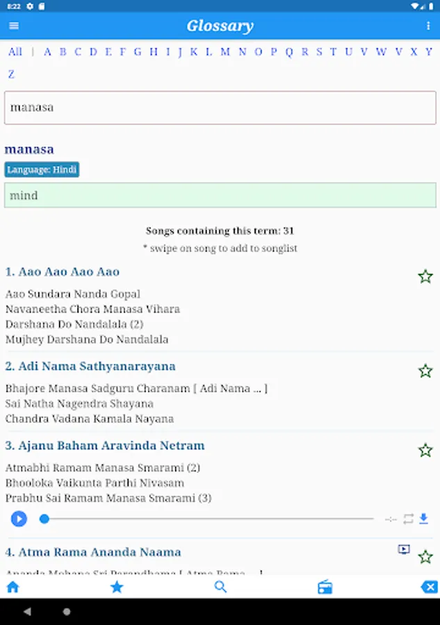 App includes song database with over 3400 songs in English, Spanish, Indian, Japanese, and other languages from across the world (about 2000 songs have audio, for others audio will be added gradually as available).