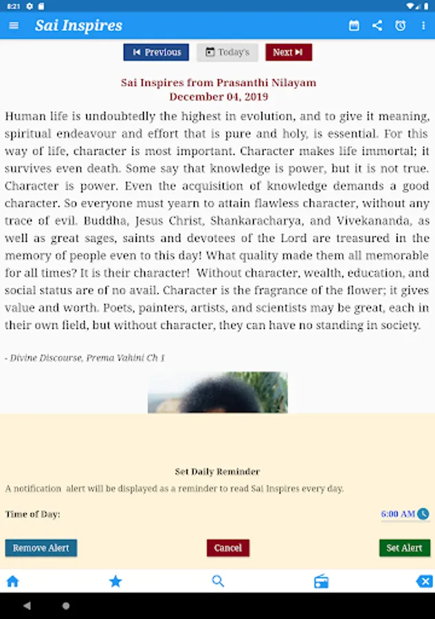 Read the daily "Sai Inspires" published by Radiosai. Provides a built-in calendar to look up the Thought For The Day for any date. Share the quote with others.