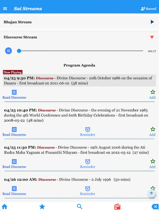Listen to the various Radiosai Streams. Streams will show the daily agenda and highlight currently playing program.