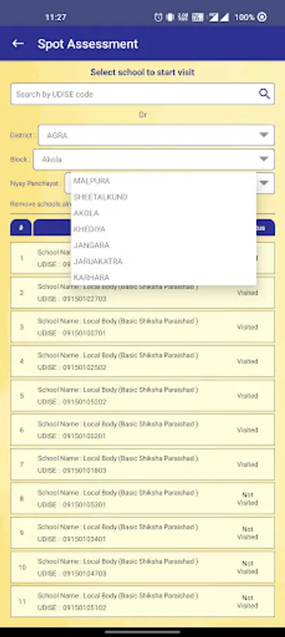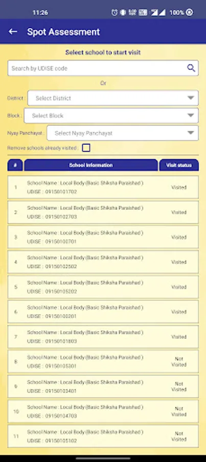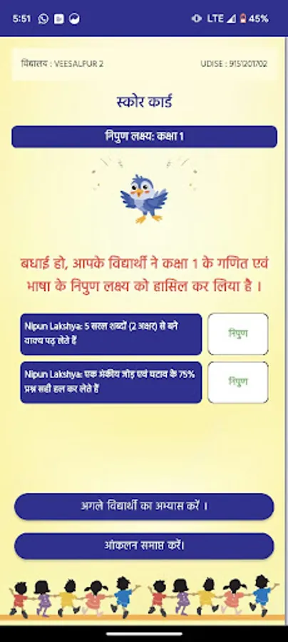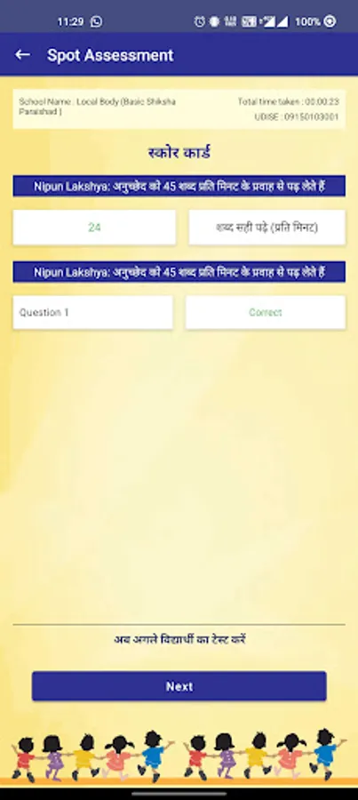 एप्लिकेशन का उपयोग करने के लिये UDISE कोड , कक्षा, एवं विषय का चयन करके छात्रों का स्पॉट असेसमेंट किया जा सकता है। | परीक्षण पूर्ण होने पर स्कोरकार्ड प्रदर्शित होगा जिसके माध्यम से मेंटर्स, शिक्षकों को प्रभावी प्रतिक्रिया दें पाएंगे ।