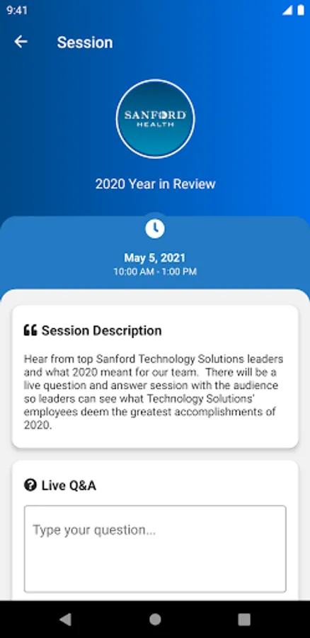 The Sanford Events app provides attendees with event information, speaker bios, event schedules, maps, and much more. This app is available for free, for use by Sanford event attendees. Please note: events require an invitation to access.