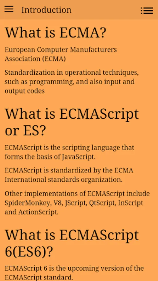 ECMAScript 2015 (6th Edition) is the current version of the ECMAScript Language Specification standard. Commonly referred to as "ES6", it defines the standard for the JavaScript implementation.