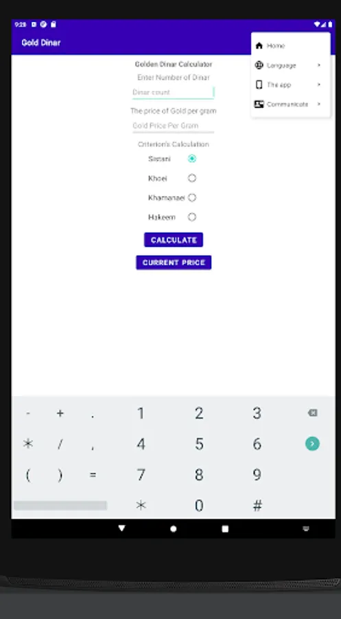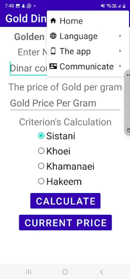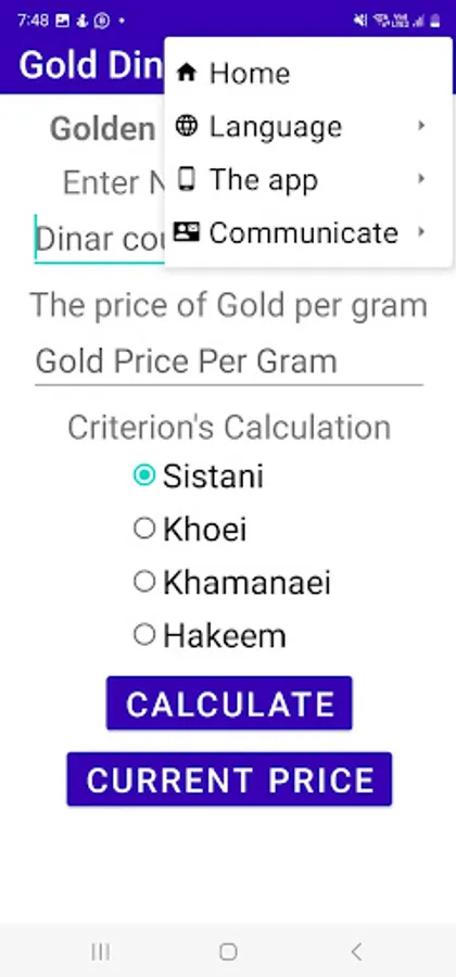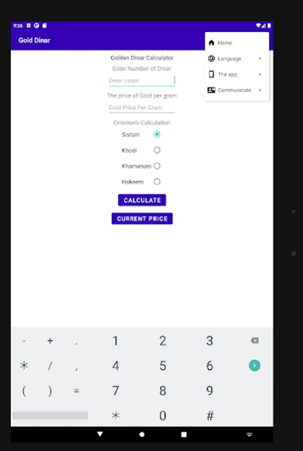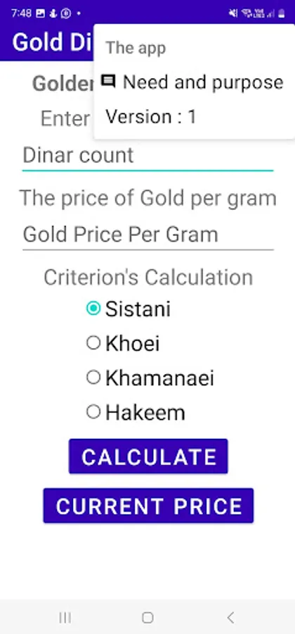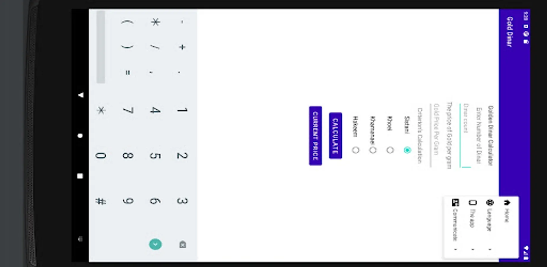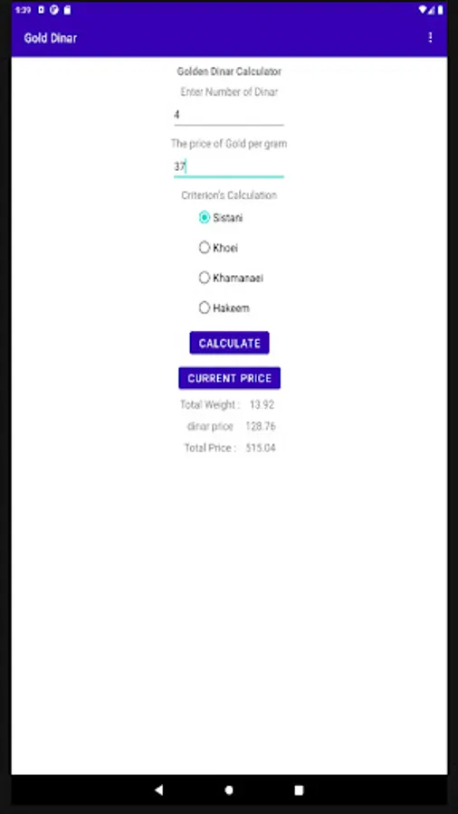 b- The app has a field to enter the number of gold dinars, and another field to enter the current price per gram of gold.
