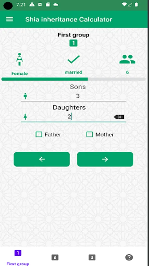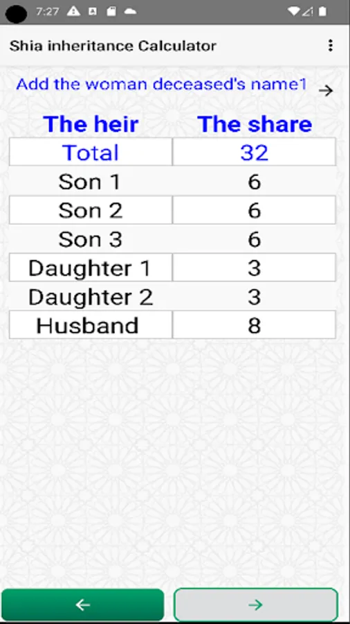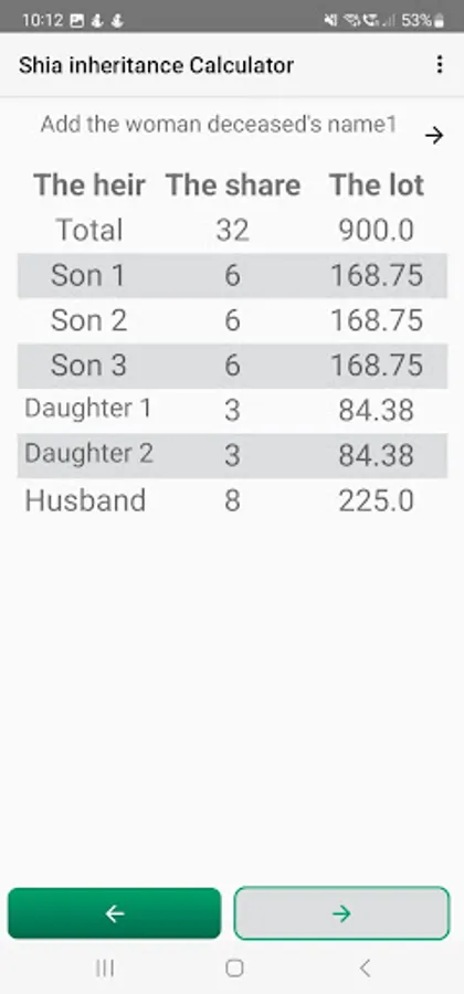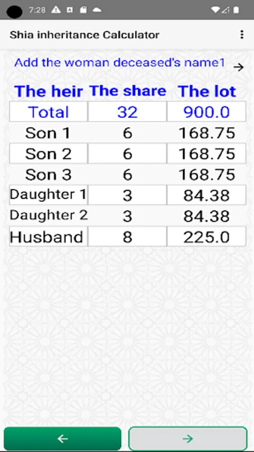 The Shia inheritance calculation application divides inheritances according to the Shiite doctrine and the fatwas of the great religious authorities (MARAJA TAQLEED). It displays the total shares of the deceased's assets, the shares of each heir, and if the user adds cash money, the app also distributes it among the heirs.