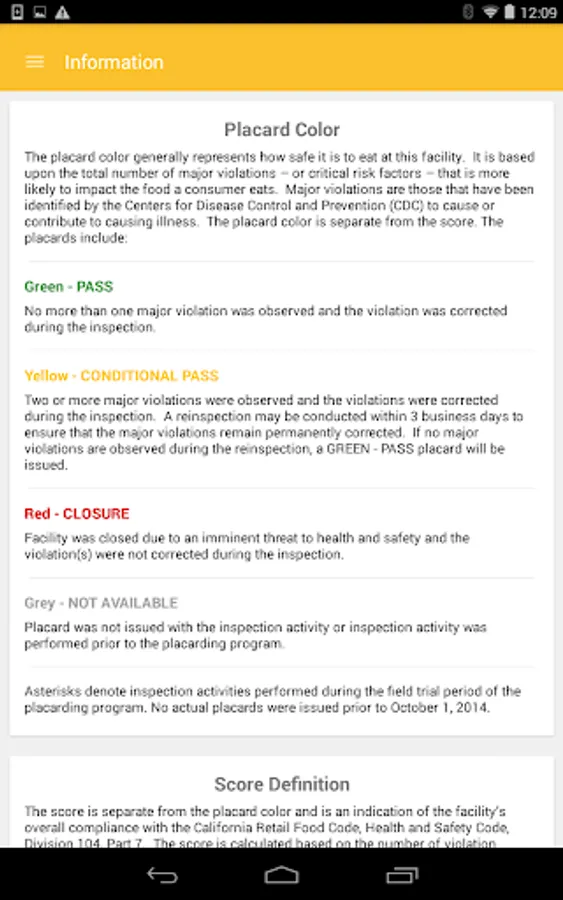 You can easily locate restaurant inspection results including a summary of violations, inspector observations, the placard color (Red, Yellow, or Green) and the compliance score. The placard color generally represents how safe it is to eat at a facility and is based upon the total number of major violations observed during an inspection. The compliance score is an indication of the overall conformity with the California Retail Food Code on a score from 0 to 100 (100 being perfect).