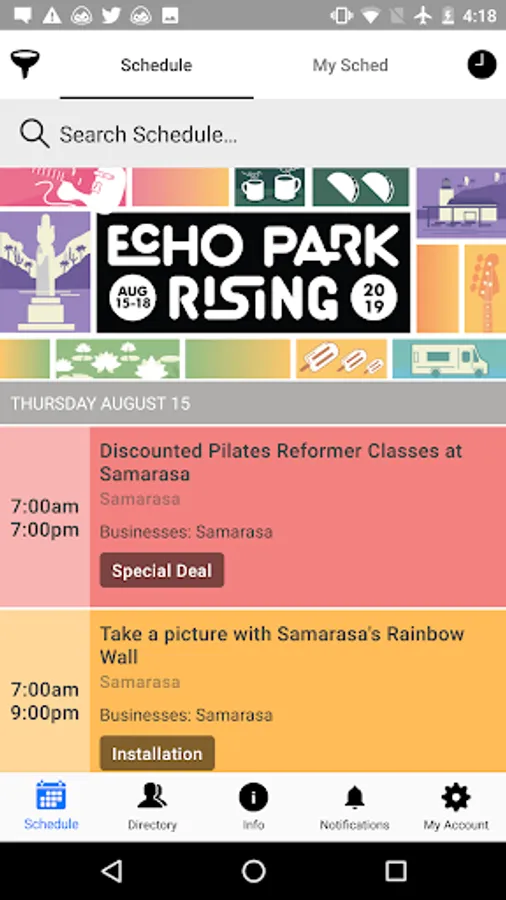 Browse the entire schedule for Echo Park Rising 2019. You can filter by color-coded types, venues or search for what you need. Get the full details of every event without having to crack open an event guide.