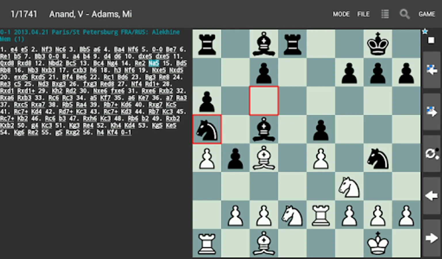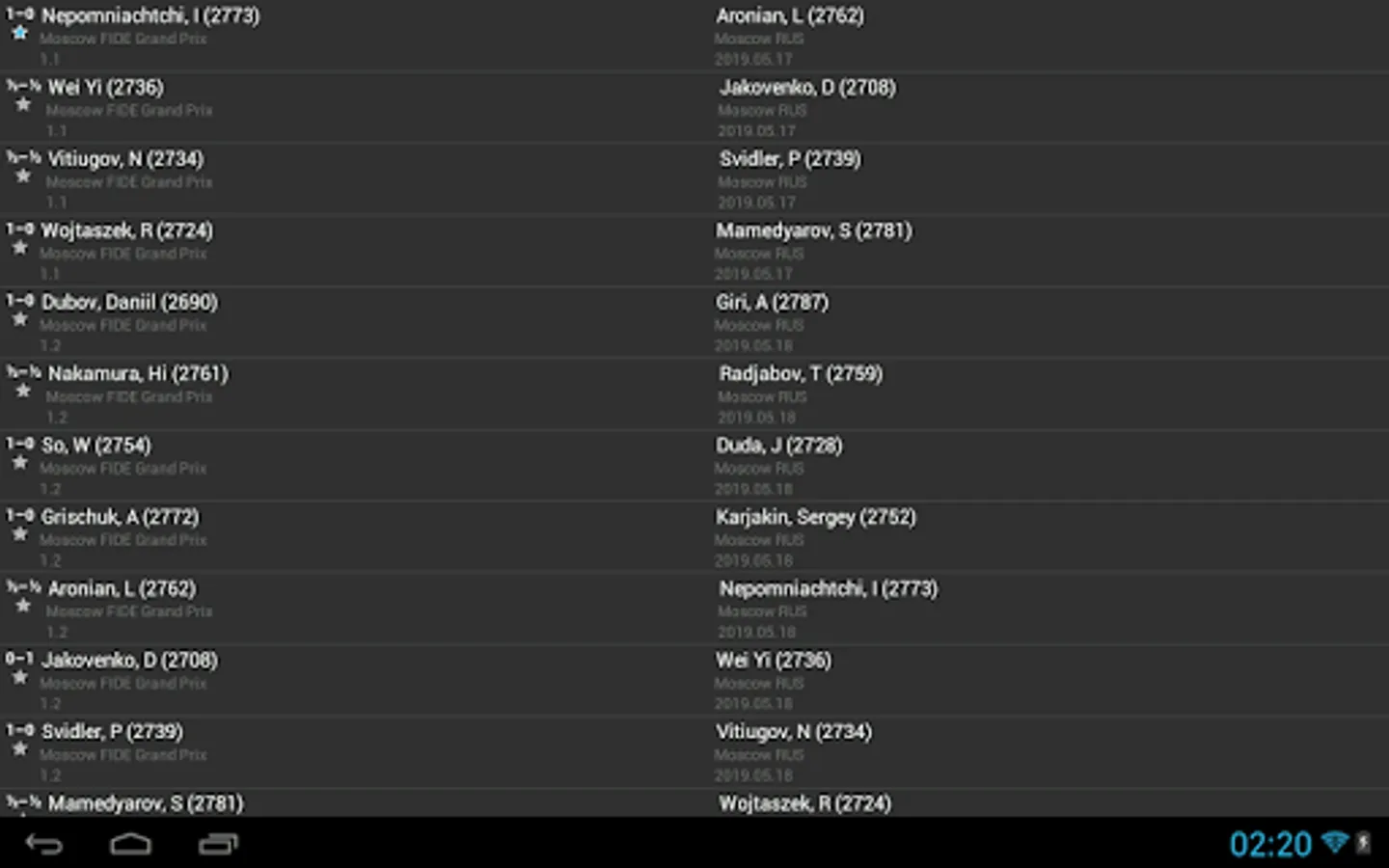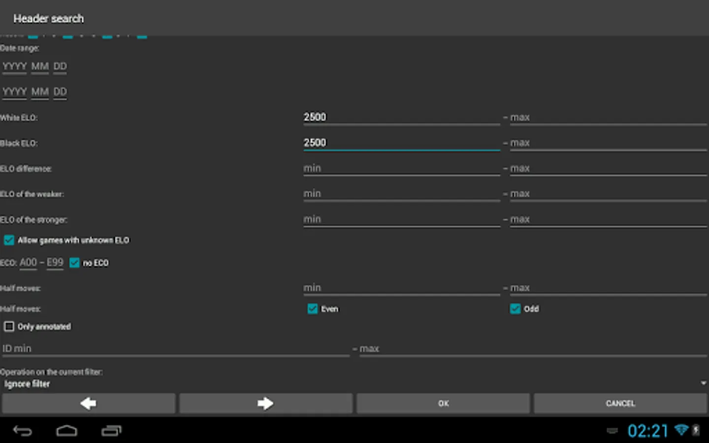 * Header search using player names, sites, events, dates, results, ECO, ELO ratings,…