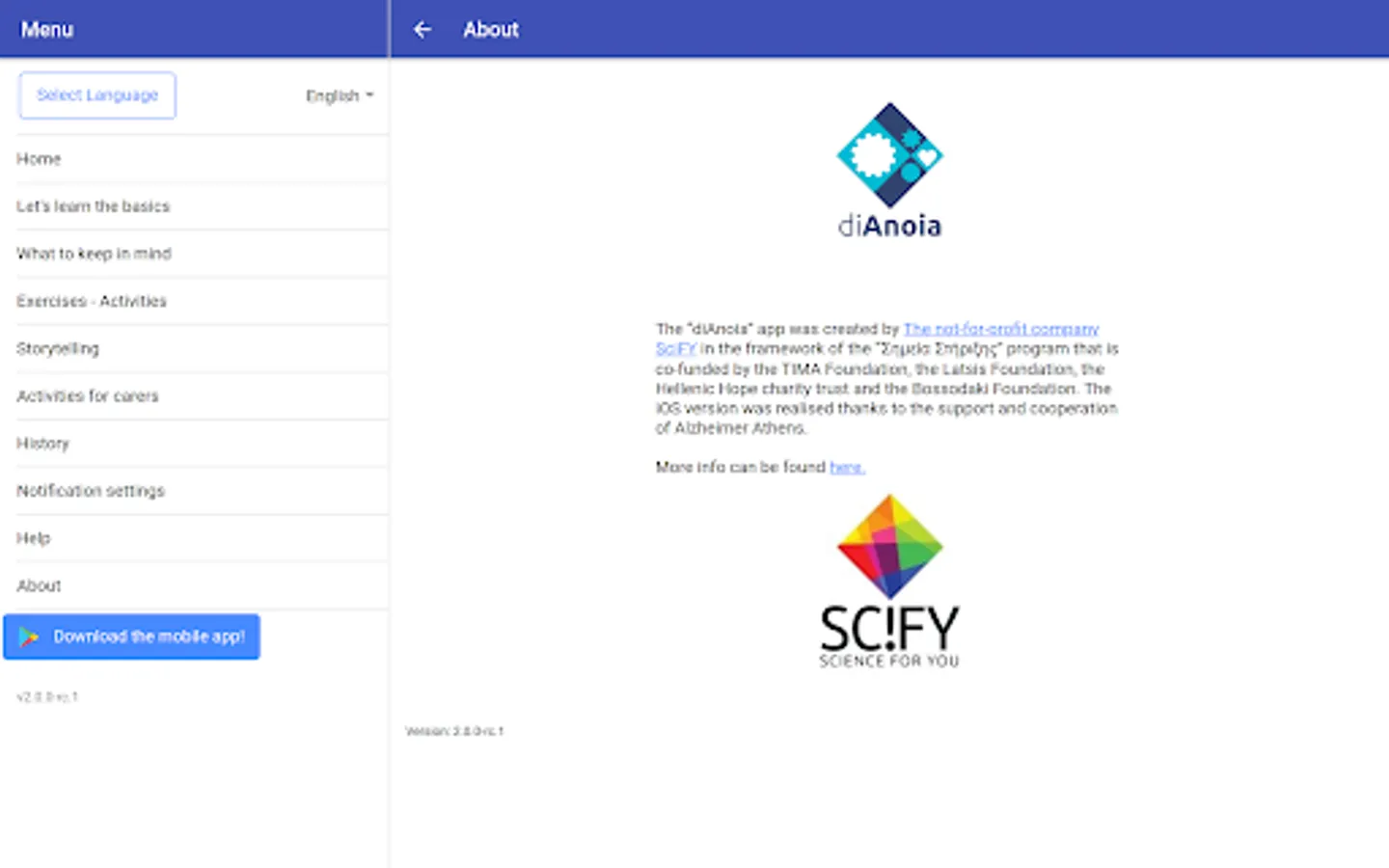 The Application “DiAnoia” was created by the Non-Profit Organization SciFY (http://www.scify.gr/) in the framework of the “Σημεία Στήριξης” program that is co-funded by the TIMA Foundation, the Latsis Foundation, the Hellenic Hope charity trust and the Bossodaki Foundation.