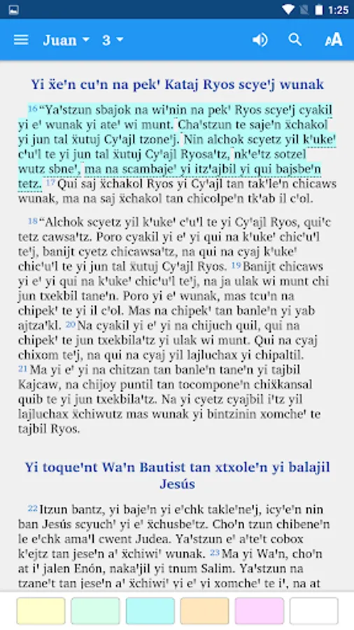 This app comes with audio and automatic text highlighting as the audio is played for books where audio is available. The app will download the audio from the web the first time the chapter is played. After that no further web connection is used or needed.