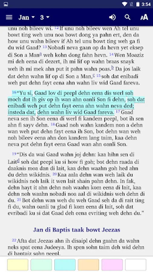 This app comes with audio and automatic text highlighting as the audio is played for books where audio is available. The app will download the audio from the web the first time the chapter is played. After that no further web connection is used or needed.