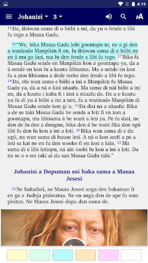 This app comes with audio and automatic text highlighting as the audio is played for books where audio is available. The app will download the audio from the web the first time the chapter is played. After that no further web connection is used or needed.