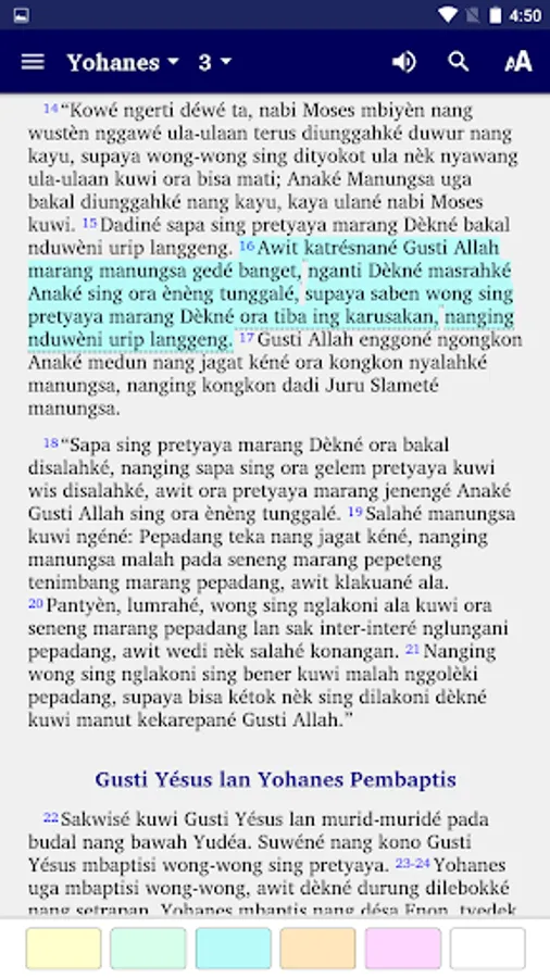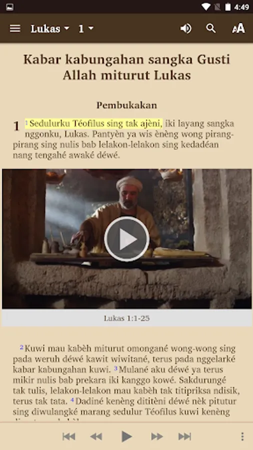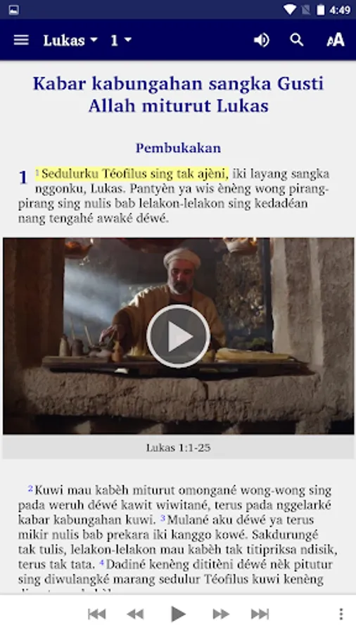 This app comes with audio and automatic text highlighting as the audio is played for books where audio is available. The app will download the audio from the web the first time the chapter is played. After that no further web connection is used or needed.
