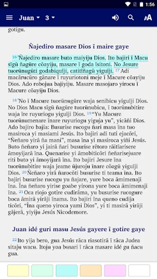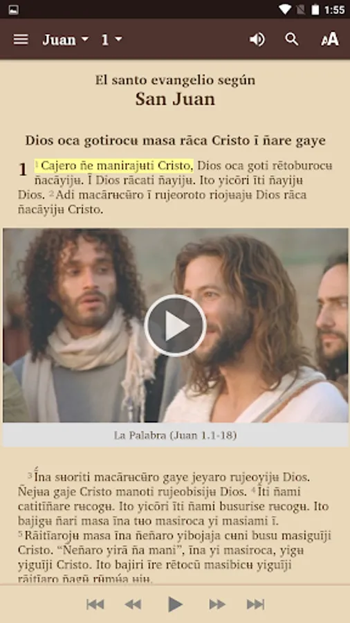 This app comes with audio and automatic text highlighting as the audio is played for books where audio is available. The app will download the audio from the web the first time the chapter is played. After that no further web connection is used or needed.