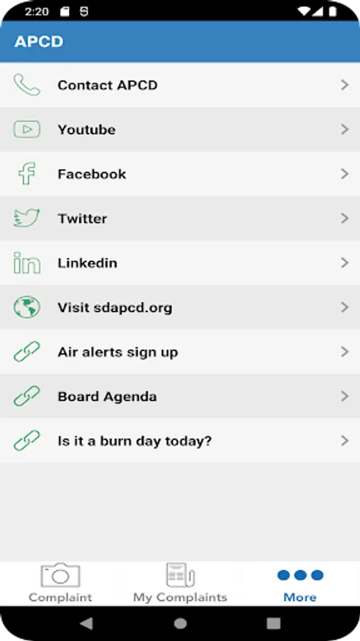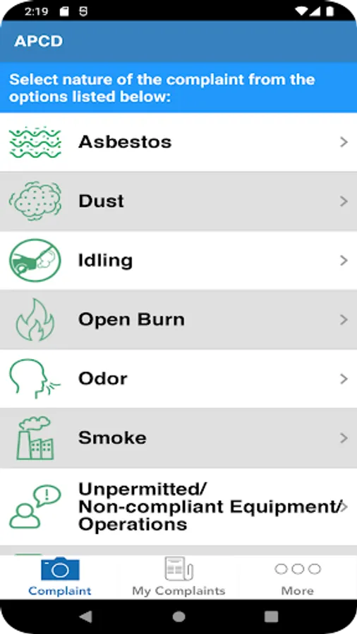 This application allows you to report air quality concerns such as odors, dust, asbestos, smoke, and others directly to the San Diego County Air Pollution Control District. The District’s Complaints Program investigates each concern submitted to verify compliance with air quality regulations within the District’s jurisdiction within 48 hours or less.