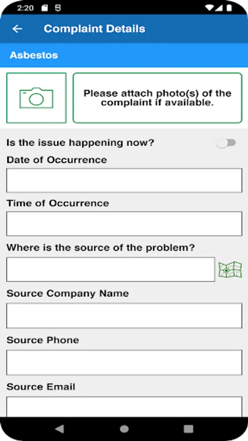 Mobile Application for reporting of air quality concerns such as odor, smoke, dust, asbestos, within San Diego County.