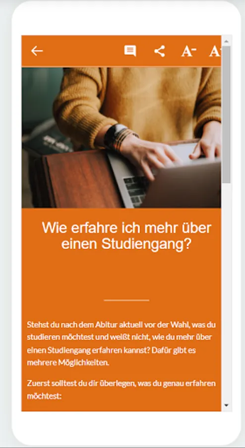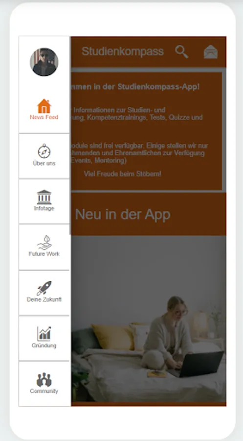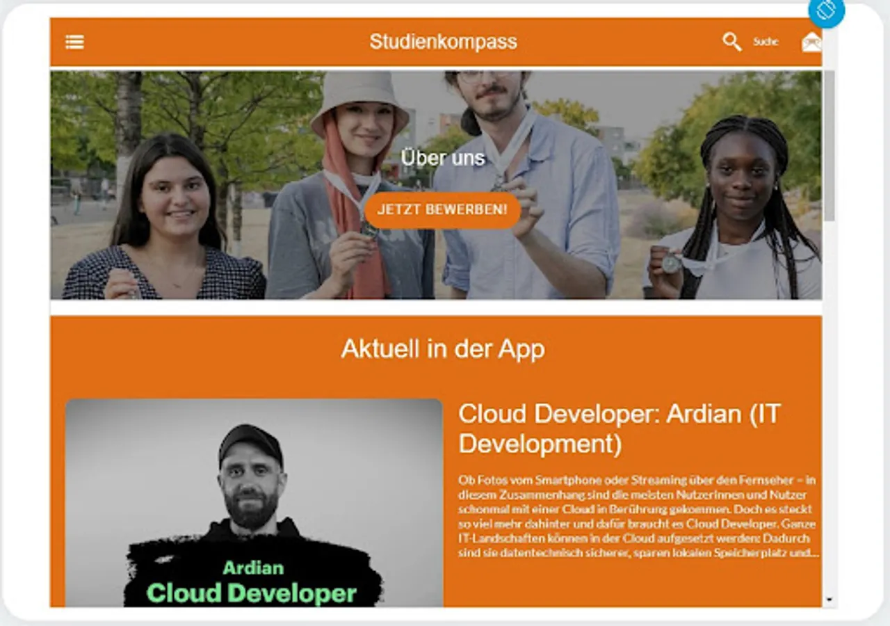The Studienkompass app contains a lot of information about your study and career orientation. This includes information on studying and training, job profiles and years of bridges, as well as financing questions and additional topics.