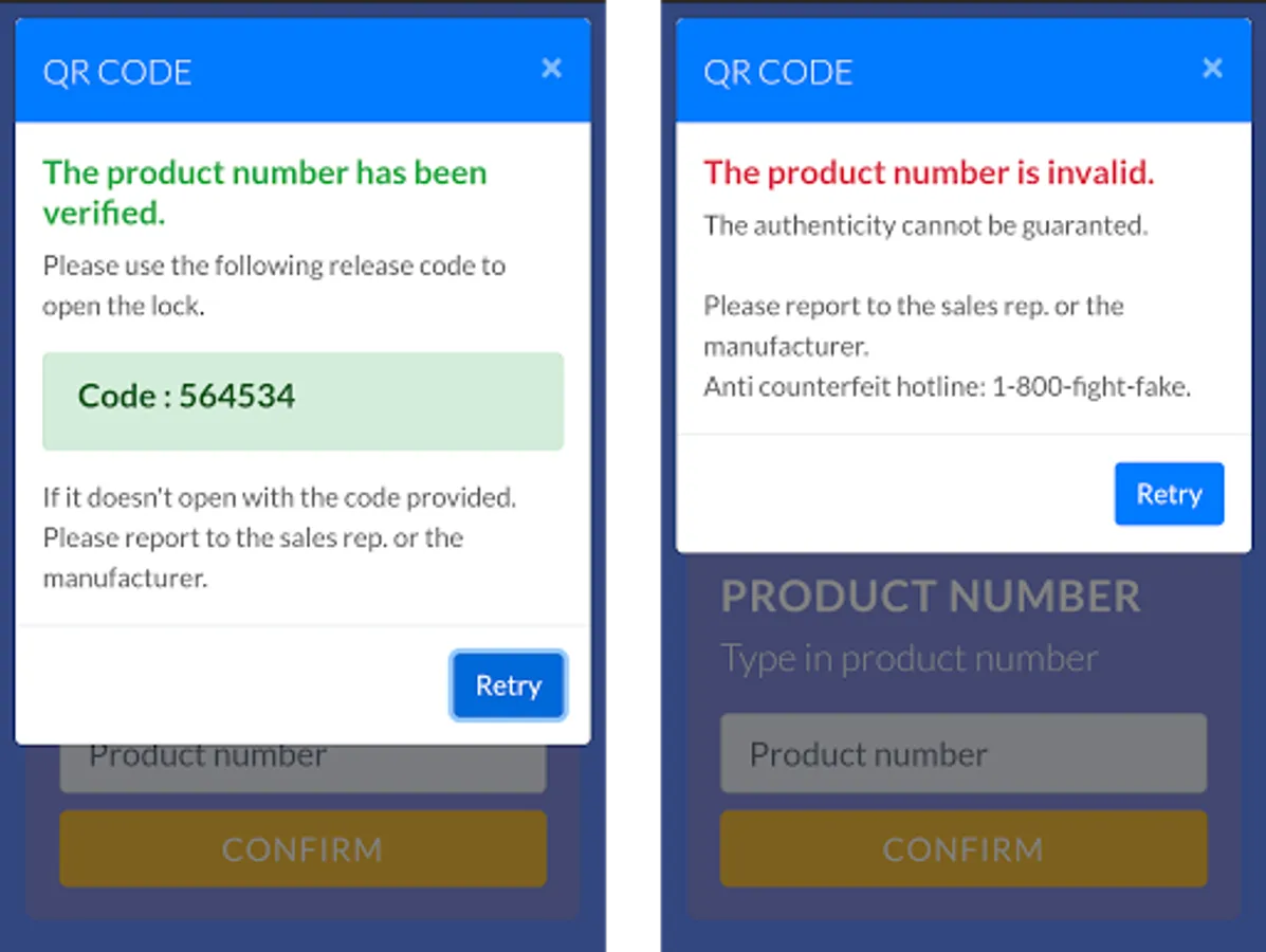 Consumers can verify the authenticity of the product by a simple verification process. All you have to do is to scan the product number with the SECUREAL App. If the product is authentic, your phone will send a code to unlock the locking device which is attached to the product through wireless communication.