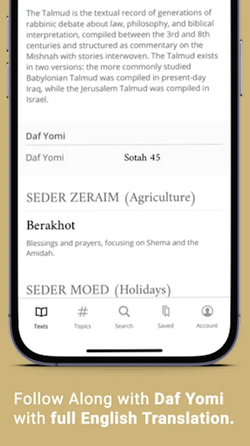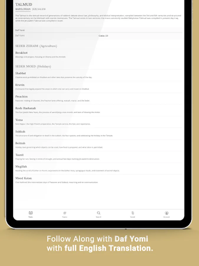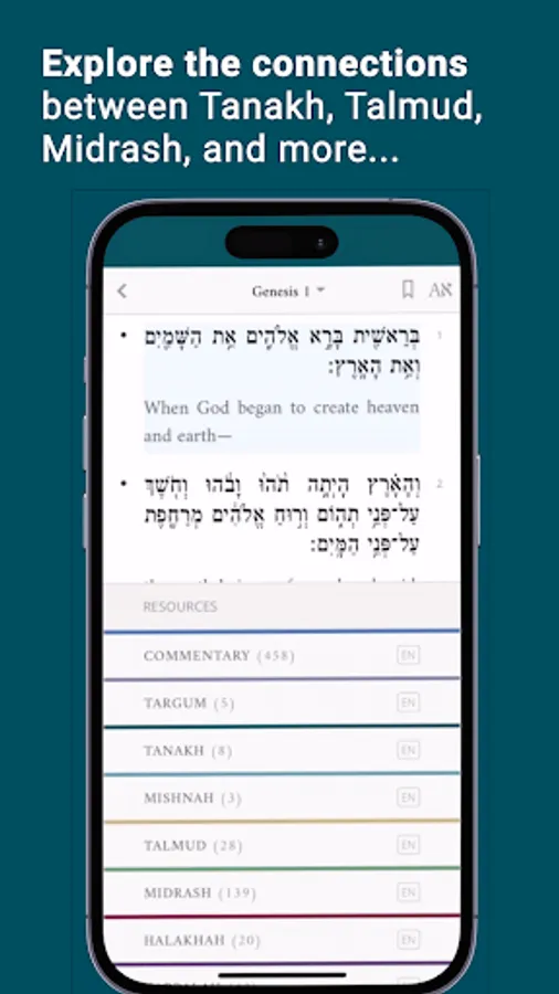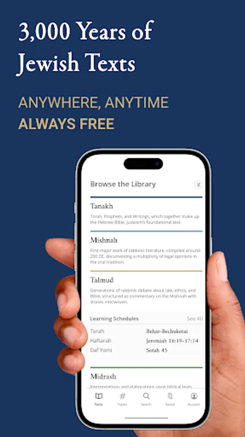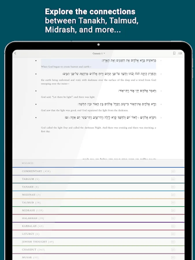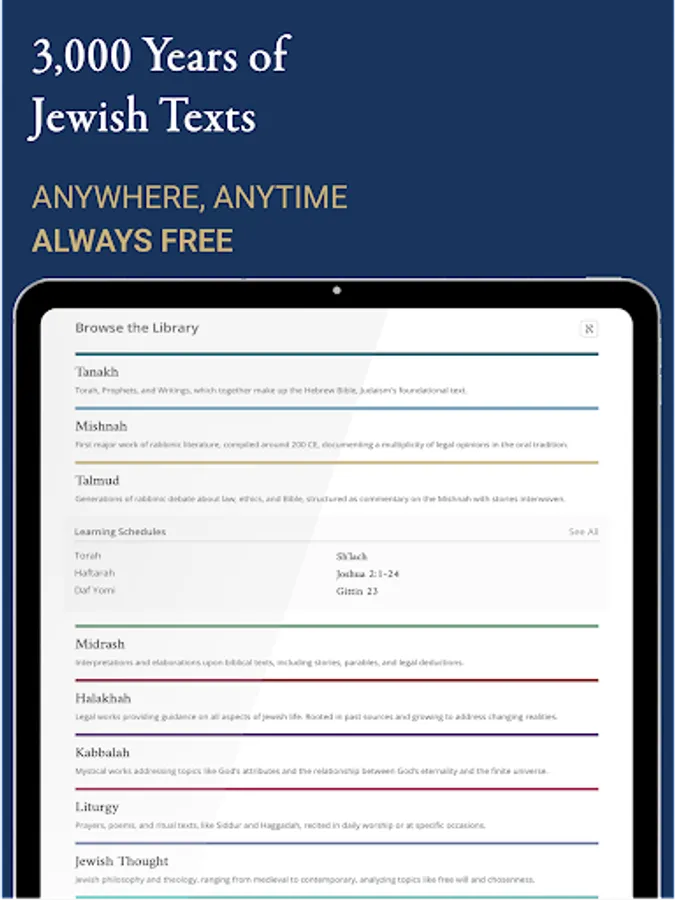 Sefaria delivers 3,000 years of Jewish texts (Torah, Tanakh, Mishnah, Talmud, and more) to your smartphone. All texts in the library are available in Hebrew along with a growing body of English translations. Search by keyword or browse the table of contents to explore texts, translations, and commentaries. Plus - the entire library can fit on your phone (500MB) so you can learn while you're offline.