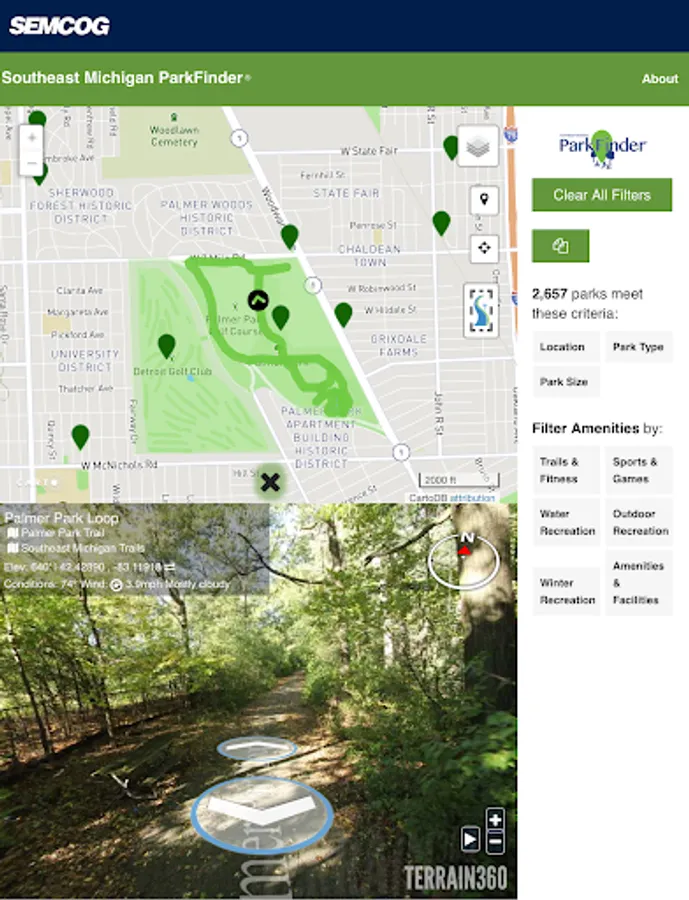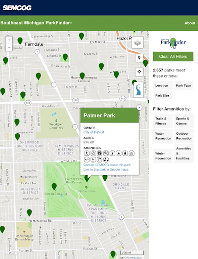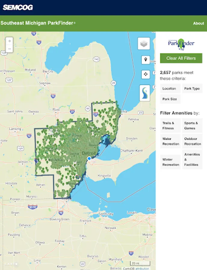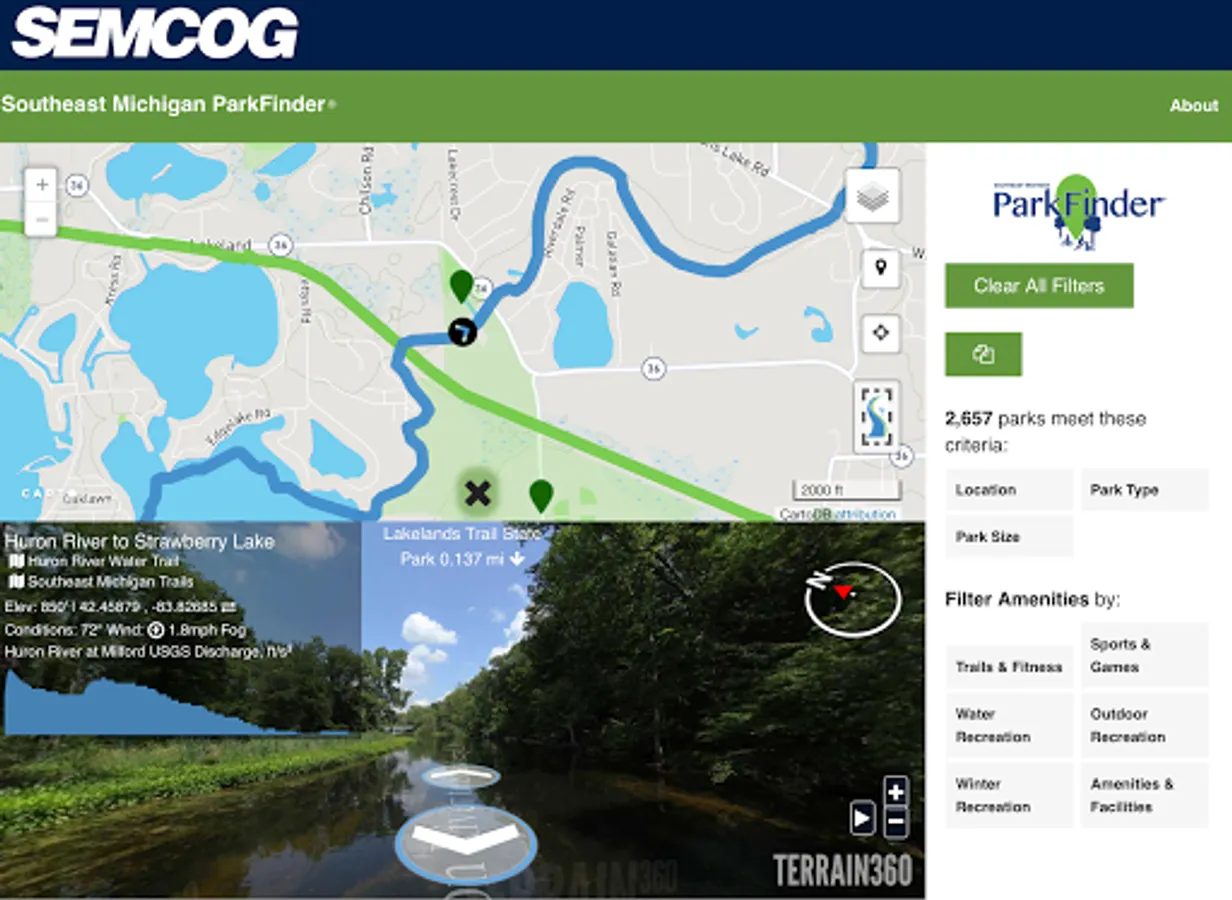Parks in Southeast Michigan are owned and operated by local communities and counties, the Huron-Clinton Metropolitan Authority, the State of Michigan, federal agencies, and private organizations. Southeast Michigan ParkFinder includes information about park amenities throughout the region, allowing users to see local, county, regional, and state parks, along with private recreation and conservation land, all on one streamlined map.