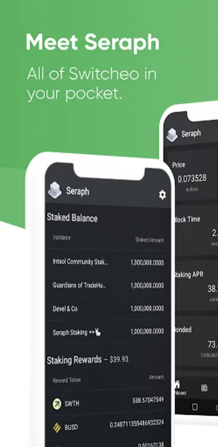 Seraph is an open-source application allowing you to follow key information of Switcheo Tradehub chain as well as tracking your wallet balances, your staking delegations and their associated tokens rewards.