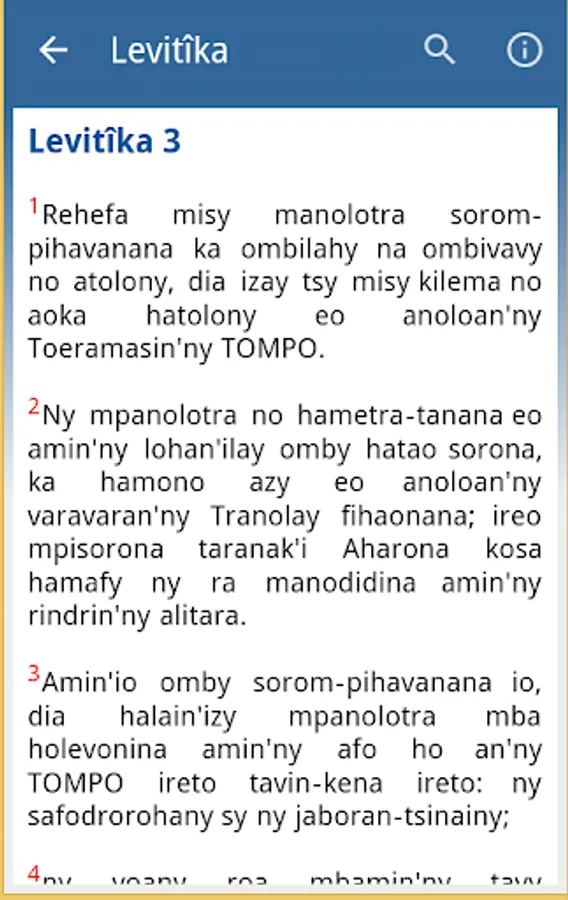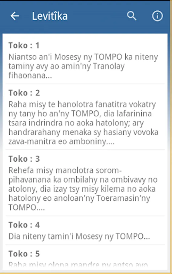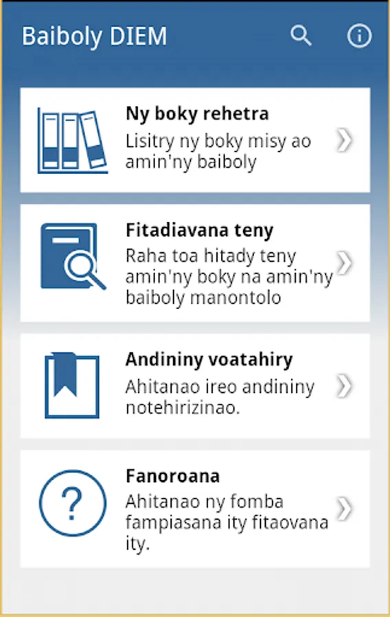 The Bible DIEM or Dikanteny Iombonana Eto Madagascar is the Ecumenical Translation of the Bible in Malagasy. With the Old and New testaments, there are also books and apocryphal texts.