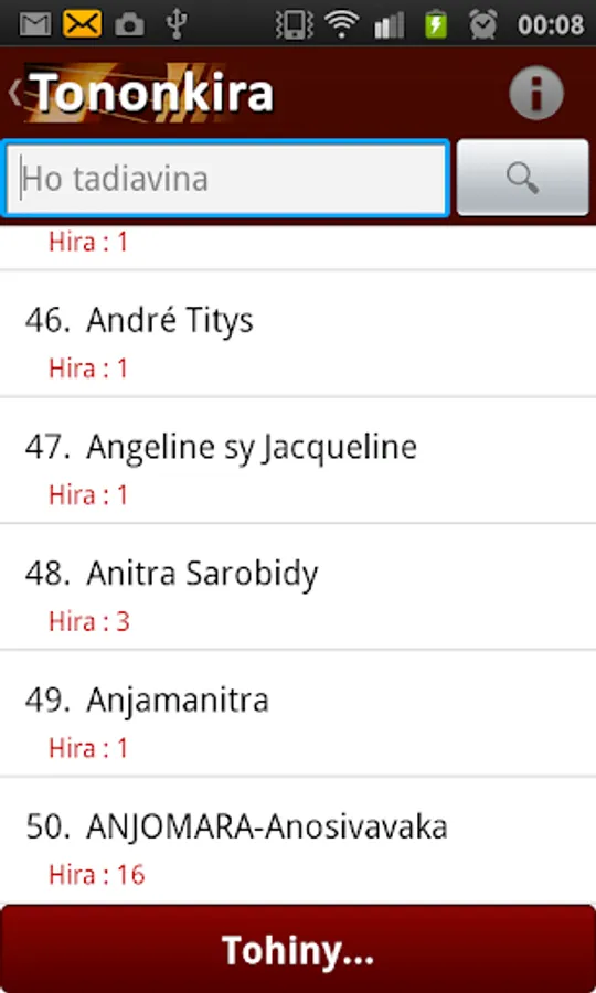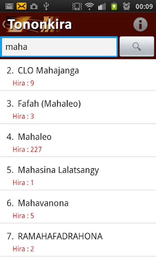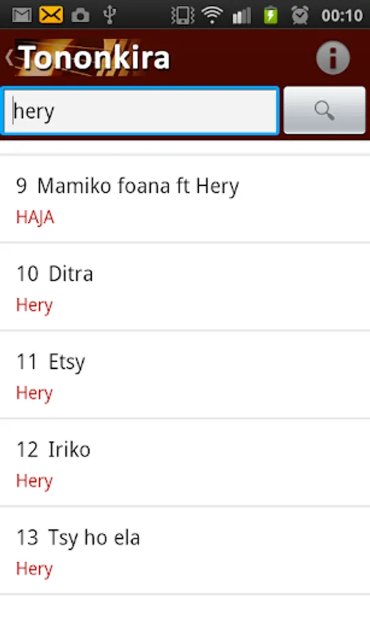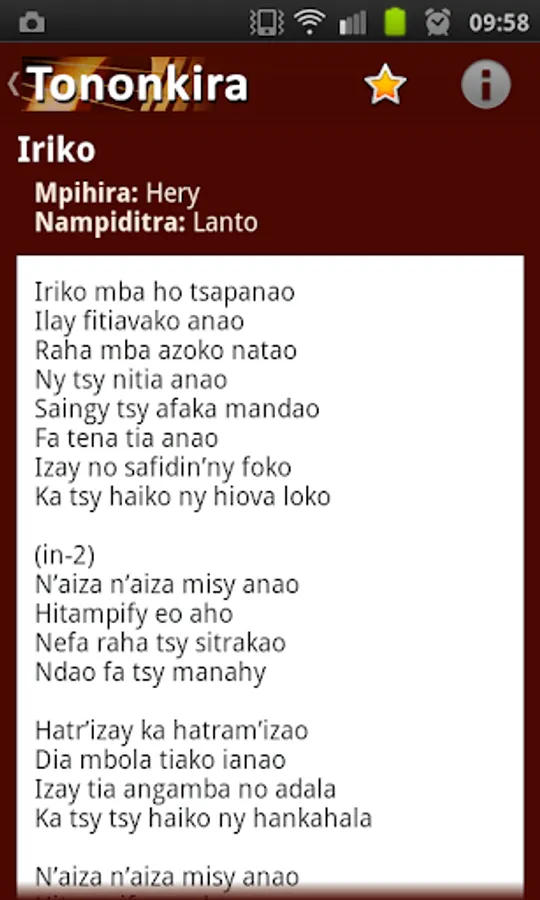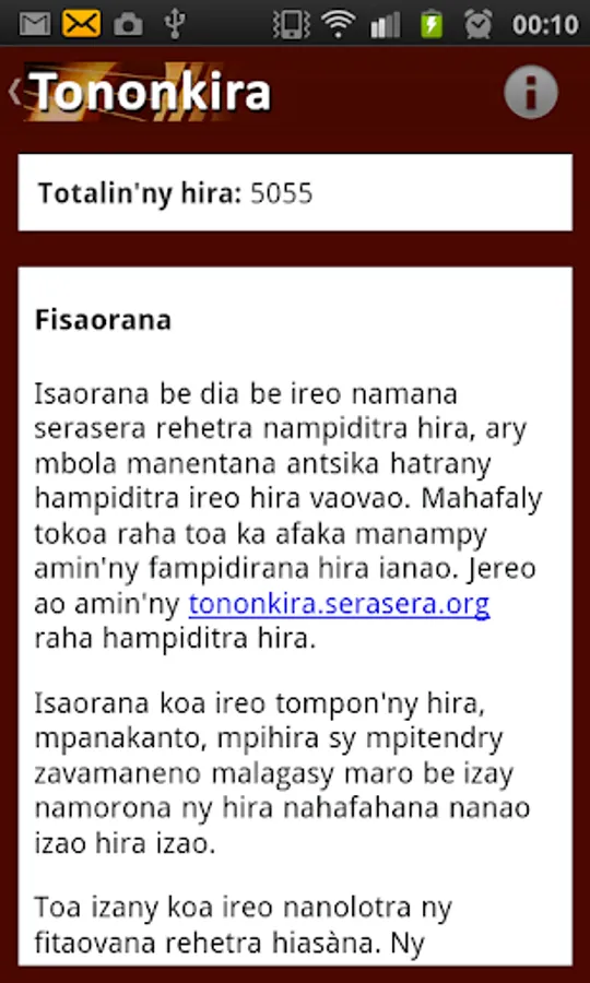 The application "Song lyrics Malagasy" or Tononkira Malagasy is a rich application of more than 5000 words members serasera.org have inserted since 2002. The application "Tononkira Malagasy" does not require internet connection except during installation.
