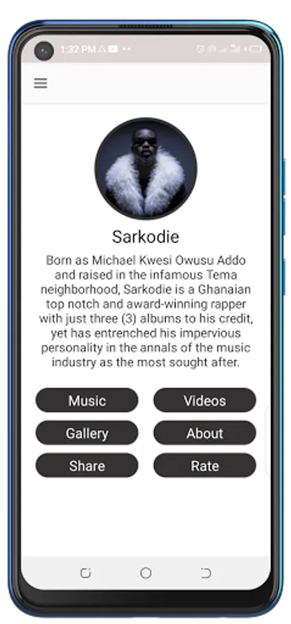 Sarkodie all songs App Contains all songs, both Audio and Videos, Gallery, Profile of Sarkodie, Chat Forum for Sarkodie fans, ability to request for a song and many more.