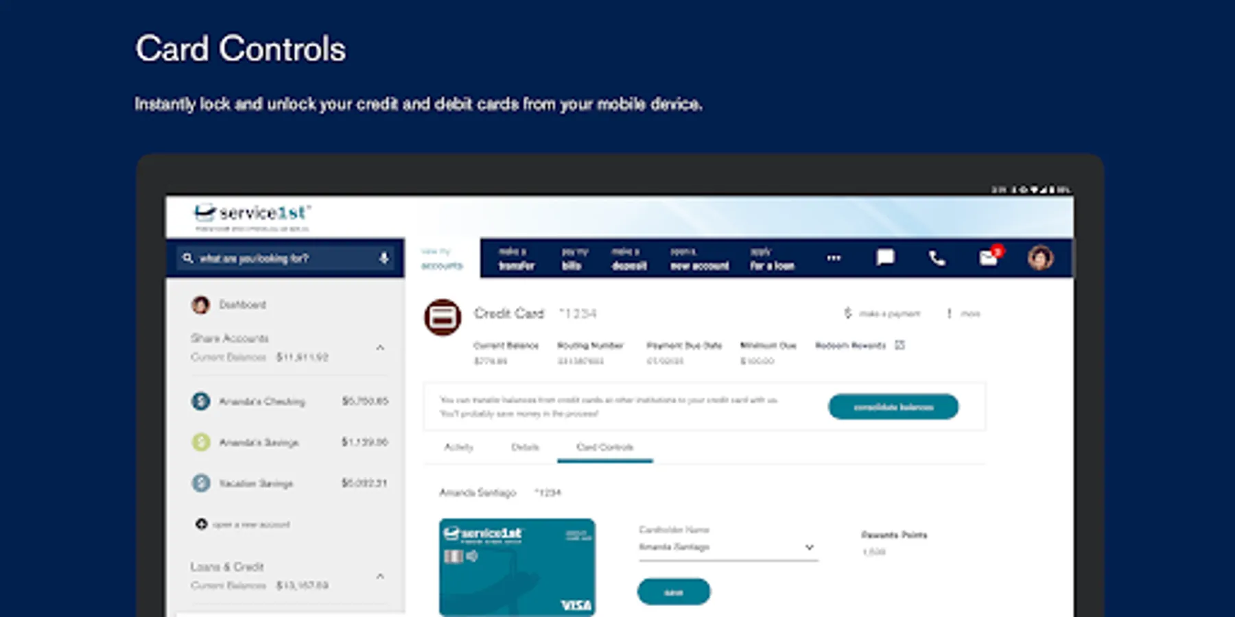 In addition to managing your checking and credit card account, you can use Service 1st Mobile for added peace of mind. For example, if you think you lost your card, you can lock it from the app and unlock it once it’s found!
