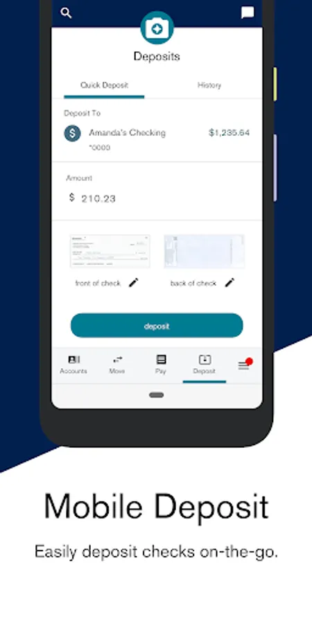 With a quick snap of a photo, deposit checks directly into your account! You’ll receive credit for checks via mobile deposit to your account without having to send or drop off your check at the branch!