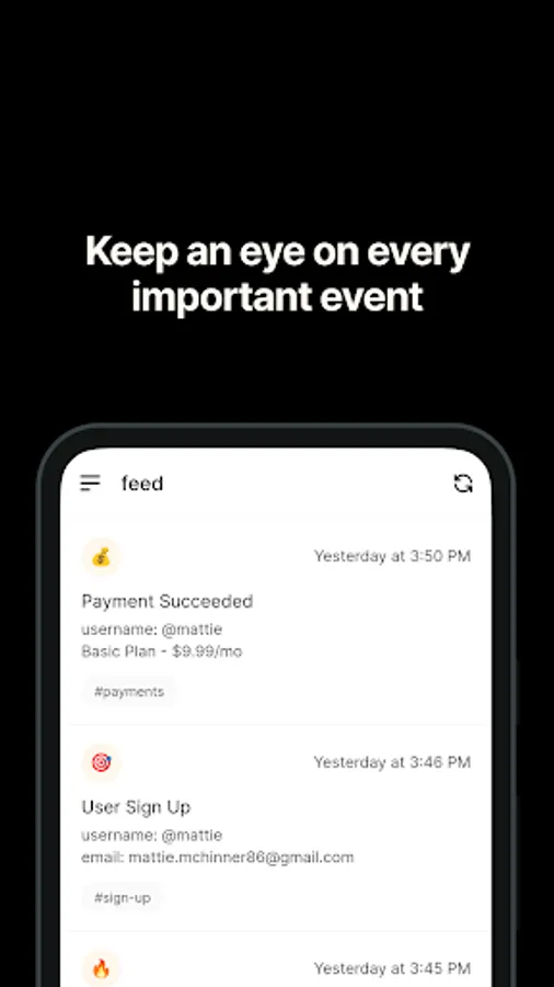 LogSnag allows you to create separate projects and organize your events into different channels per topic. In addition, LogSnag provides chronological feeds for each one of your projects as well as a global feed combining all of your events into a single, beautiful timeline.