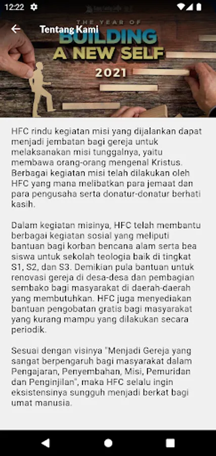 In accordance with its vision of "Being a Church that is very influential for society in Teaching, Worshiping, Mission, Discipleship and Evangelization", HFC always wants its existence to be a blessing for mankind.