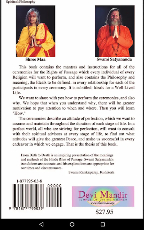 From Birth to Death app contains the mantras, instructions, applications, and philosophy for all the rites of passage in the Hindu dharma from the Vedic wedding ceremony to the funeral rites performed at the end of life. The basic resource for this is the compilation is the Purohit Darpana, which is probably the most prestigious and practical authoritative text on Hindu ceremonies. The last half of the book is a questions and answers section compiled from the online classes that took place in 2010. Comprising 717 pages and complete with original Sanskrit mantras, Roman transliteration and English translation.