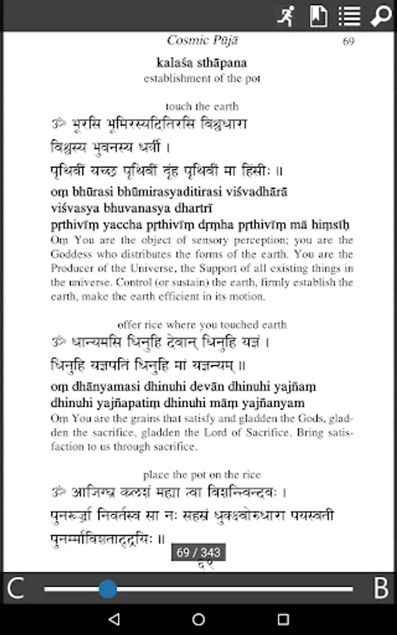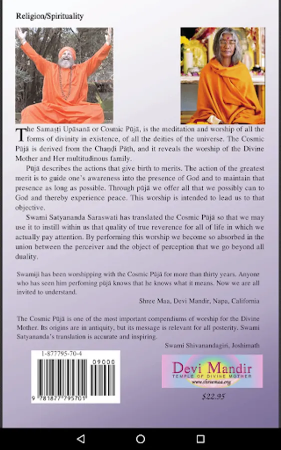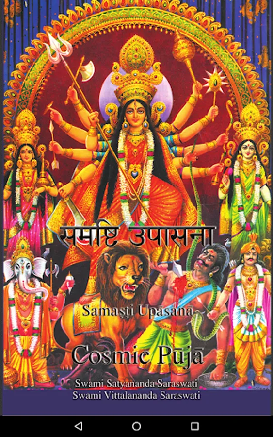 Through puja we offer all that we possibly can to God and thereby experience peace. This worship is intended to lead us to that objective. Swami Satyananda Saraswati has translated the Cosmic Puja so that we may use it to instill within us that quality of true reverence for all of life in which we actually pay attention. By performing this worship we become so absorbed in the union between the perceiver and the object of perception that we go beyond all duality.