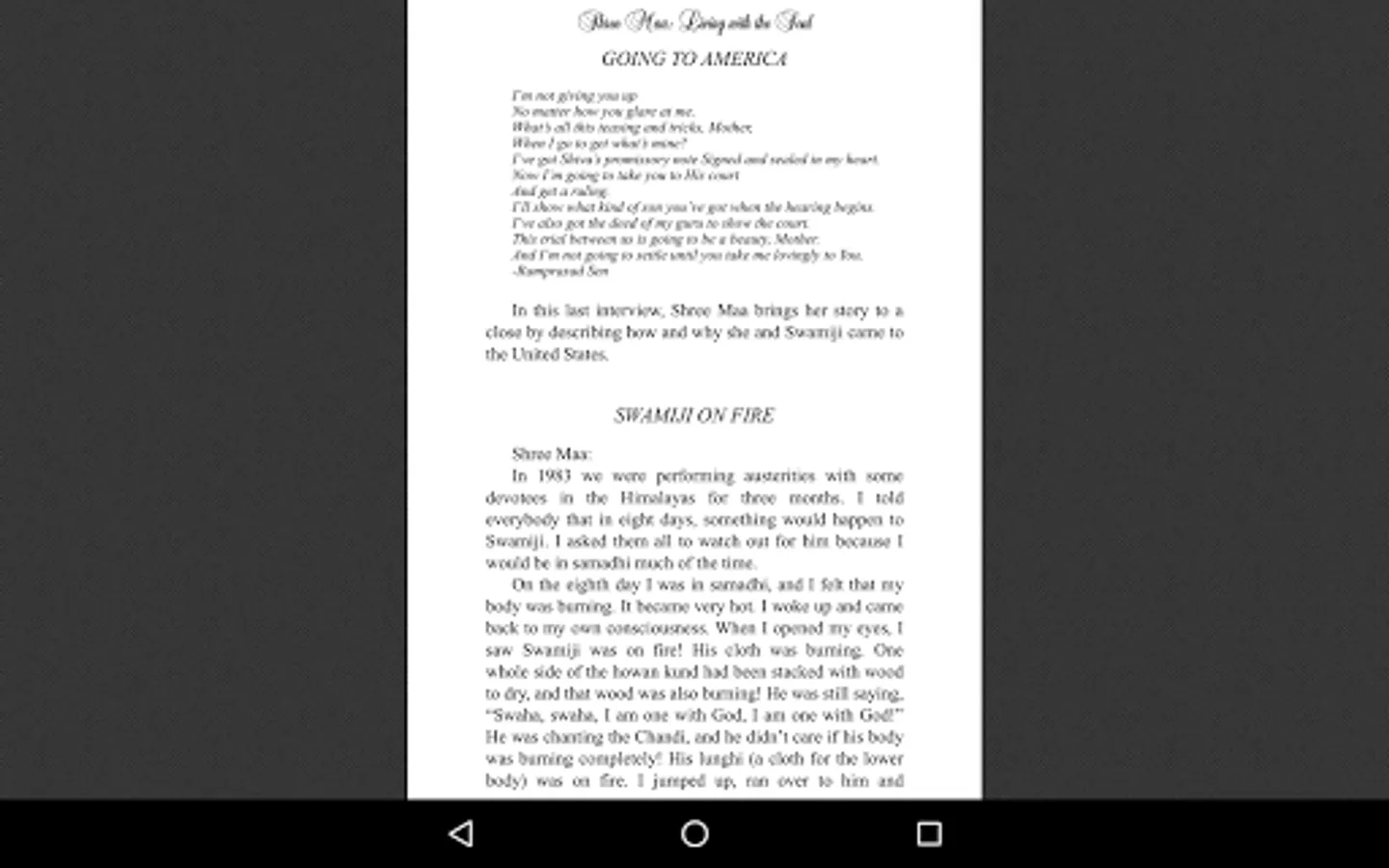 In 1984, she came to America, and now lives a very simple life dedicated to daily worship. Fame and wealth could easily be hers, but she wants nothing to do with them, preferring to own very little, and to offer all to God.