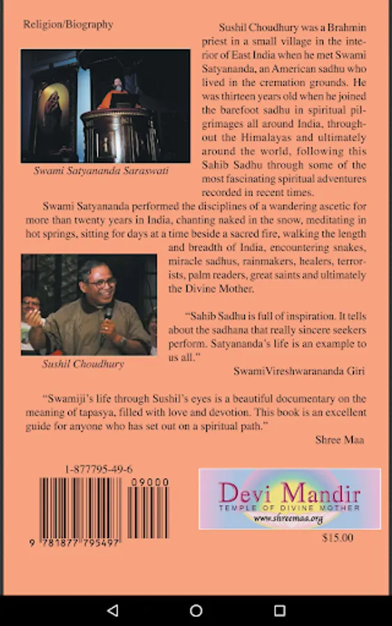 Sushil Choudhury was a Brahmin priest in a small village in the interior of East India when he met Swami Satyananda, an American sadhu who lived in the cremation grounds. He was thirteen years old when he joined the barefoot sadhu in spiritual pilgrimages all around India, throughout the Himalayas and ultimately around the world, following this Sahib Sadhu through some of the most fascinating spiritual adventures recorded in recent times.