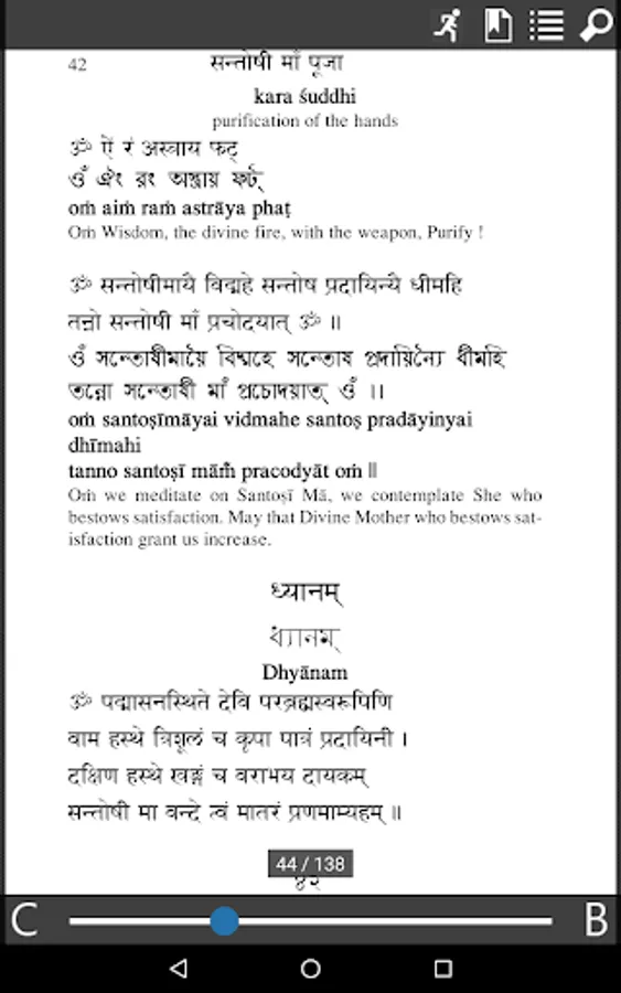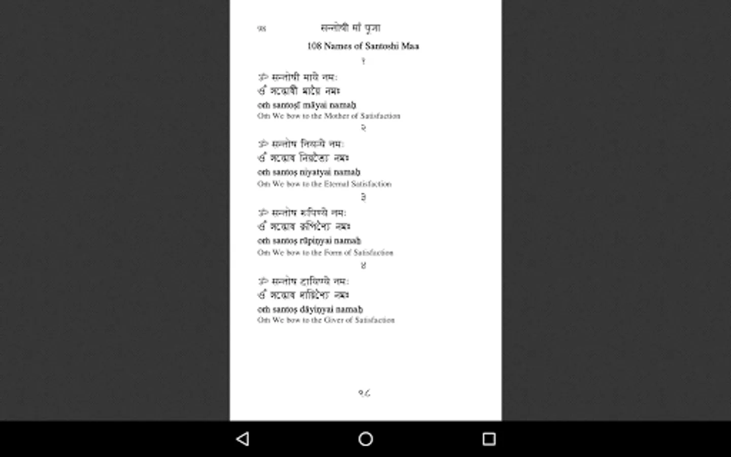 Santoshi Maa is the Goddess of Satisfaction, Contentment, Peace,and Acceptance. Her worship inspires these qualities within devotees. This Puja contains Her Dhyanam, Nyasa, the offering of items used in Her worship, and Her One Hundred Eight Names. It is offered in Sanskrit, Bengali, and Roman, with an English translation. Everyone is invited to join in the worship of the Goddess of Satisfaction. Santoshi Maa is full of delight! May She grant Peace and Satisfaction to all devotees who perform Her worship.