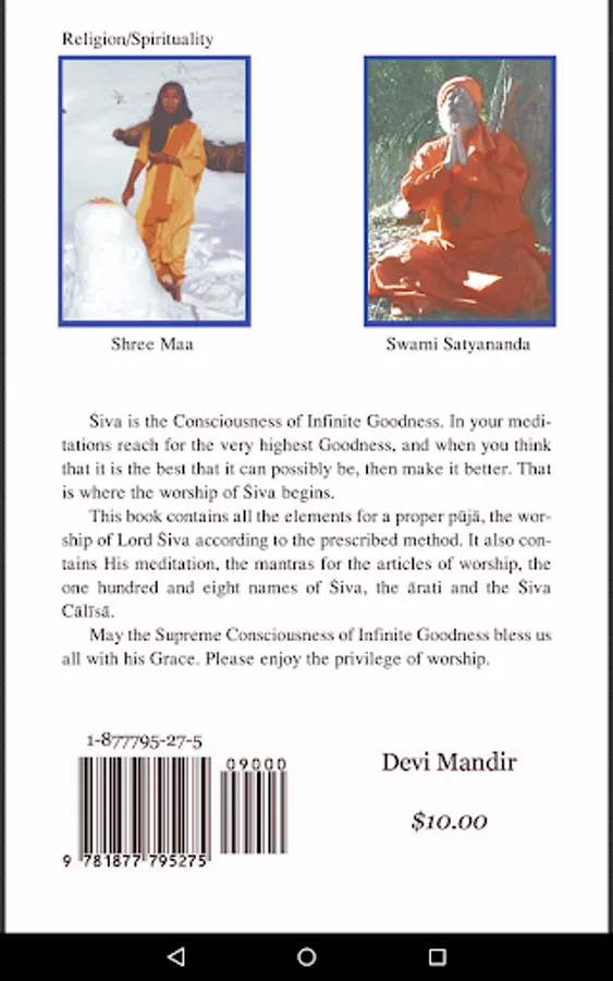This book contains all the elements for a proper puja, including Shiva’s meditation, mantras for the articles of worship, His one hundred and eight names, arati, and the Shiva Calisa. All mantras are presented with the original Sanskrit, Roman transliteration, and English translation. Also included is a guide to Sanskrit pronunciation.